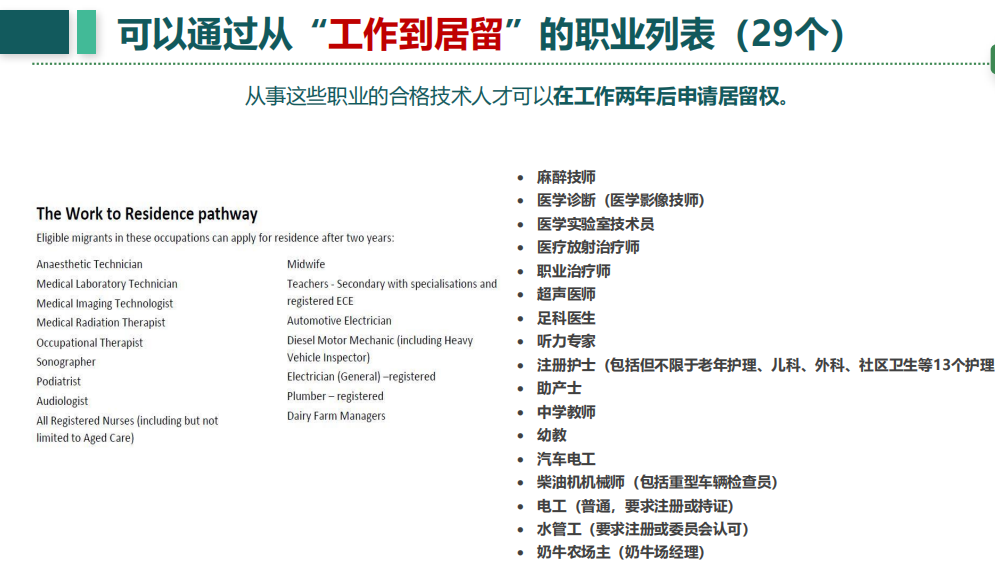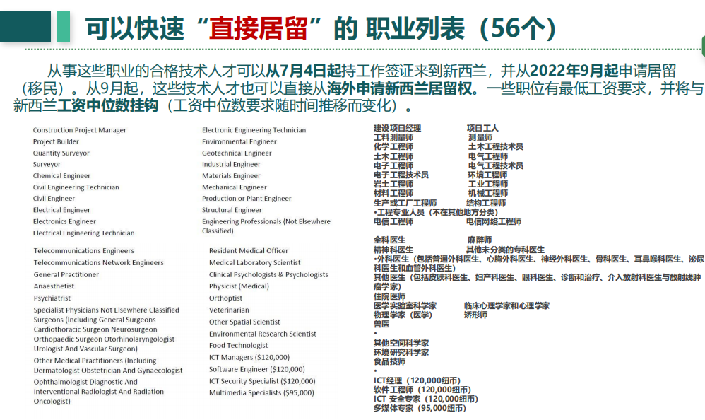 “绿色名单”共计包括85个难以填补的职业,其中 56 个职位可以海外直接获得居留权,29 个职位可以在工作两年后申请居留权,这些职位将有注册、资格或经验要求。在其他岗位上,支付至少两倍于新西兰工资中位数的移民工人也可以在工作两年后申请居留权。